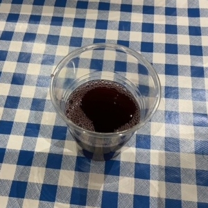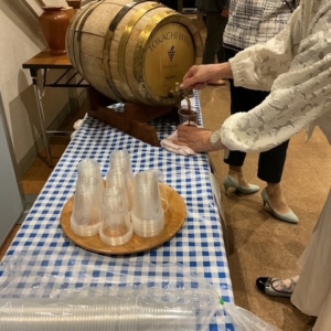 おお、寒い。と入ると、ロビーでワイン樽から赤紫色の液体のサービスが。「あ、ワイン⁈」と思った私は早合点。皆、車で移動の土地です、アルコールは出しません。ブドウジュースでした。「私、歩いて来たんですけど・・・。」